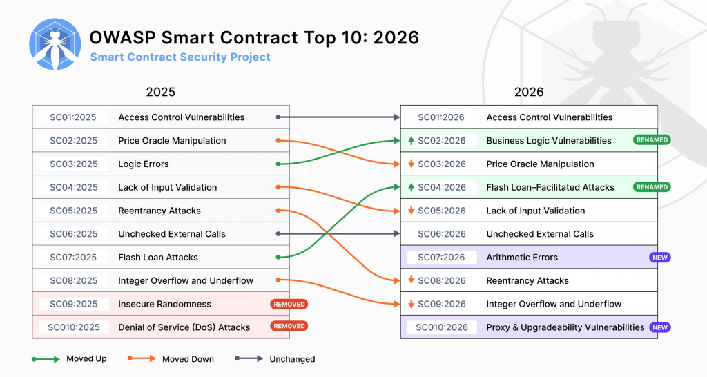 The OWASP Smart Contract Top 10 (2026) provides a production-driven prioritization model grounded in real incident patterns.